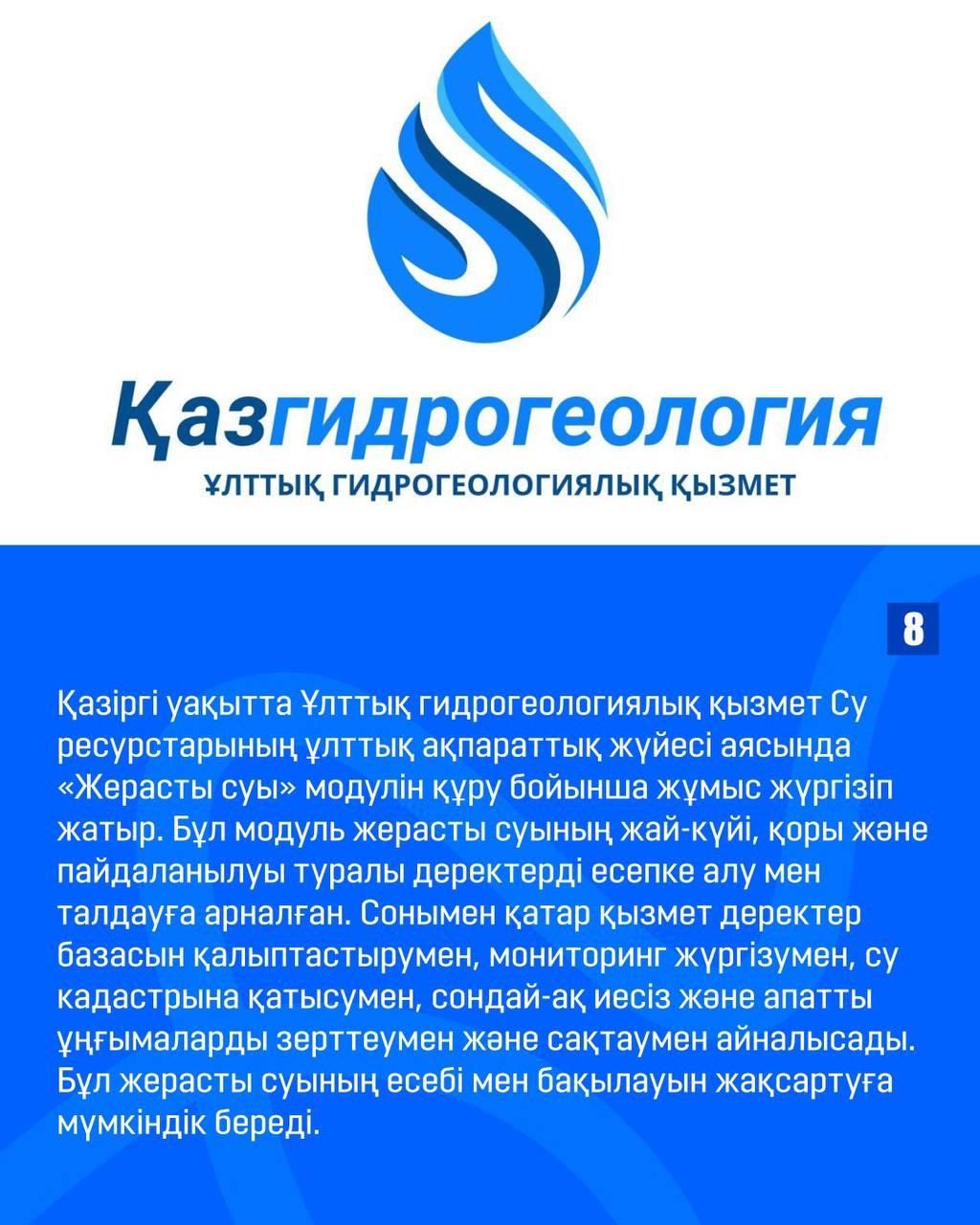 8. Қазіргі уақытта Ұлттық гидрогеологиялық қызмет Су ресурстарының ұлттық ақпараттық жүйесі аясында «Жерасты суы» модулін құру бойынша жұмыс жүргізіп жатыр. Бұл модуль жерасты суының жай-күйі, қоры және пайдаланылуы туралы деректерді есепке алу мен талдауға арналған. Сонымен қатар қызмет деректер базасын қалыптастырумен, мониторинг жүргізумен, су кадастрына қатысумен, сондай-ақ иесіз және апатты ұңғымаларды зерттеумен және сақтаумен айналысады. Бұл жерасты суының есебі мен бақылауын жақсартуға мүмкіндік береді.