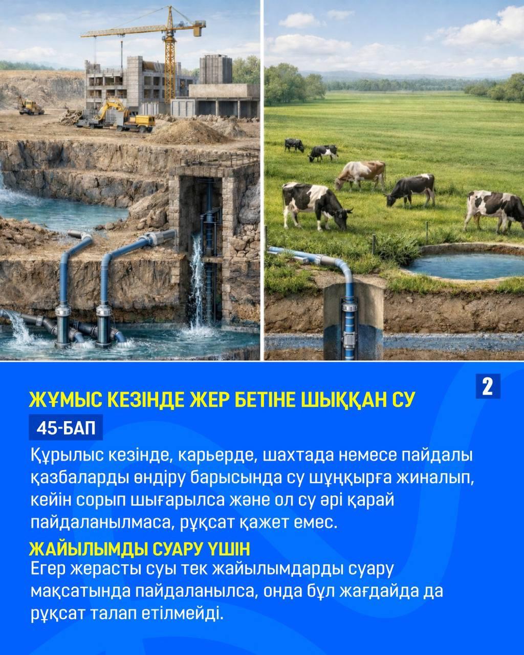 Құрылыс кезінде, карьерде, шахтада немесе пайдалы қазбаларды өндіру барысында су шұңқырға жиналып, кейін сорып шығарылса және ол су әрі қарай пайдаланылмаса, рұқсат қажет емес.