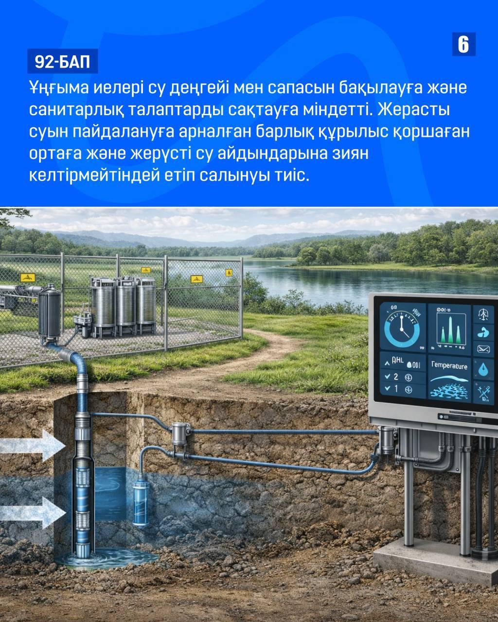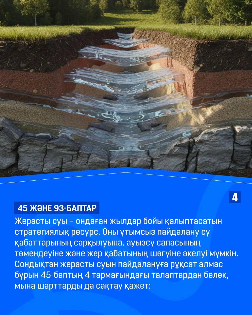 Жерасты суы – ондаған жылдар бойы қалыптасатын стратегиялық ресурс. Оны ұтымсыз пайдалану су қабаттарының сарқылуына, ауызсу сапасының төмендеуіне және жер қабатының шөгуіне әкелуі мүмкін. Сондықтан жерасты суын пайдалануға рұқсат алмас бұрын 45-баптың 4-тармағындағы талаптардан бөлек, мына шарттарды да сақтау қажет: