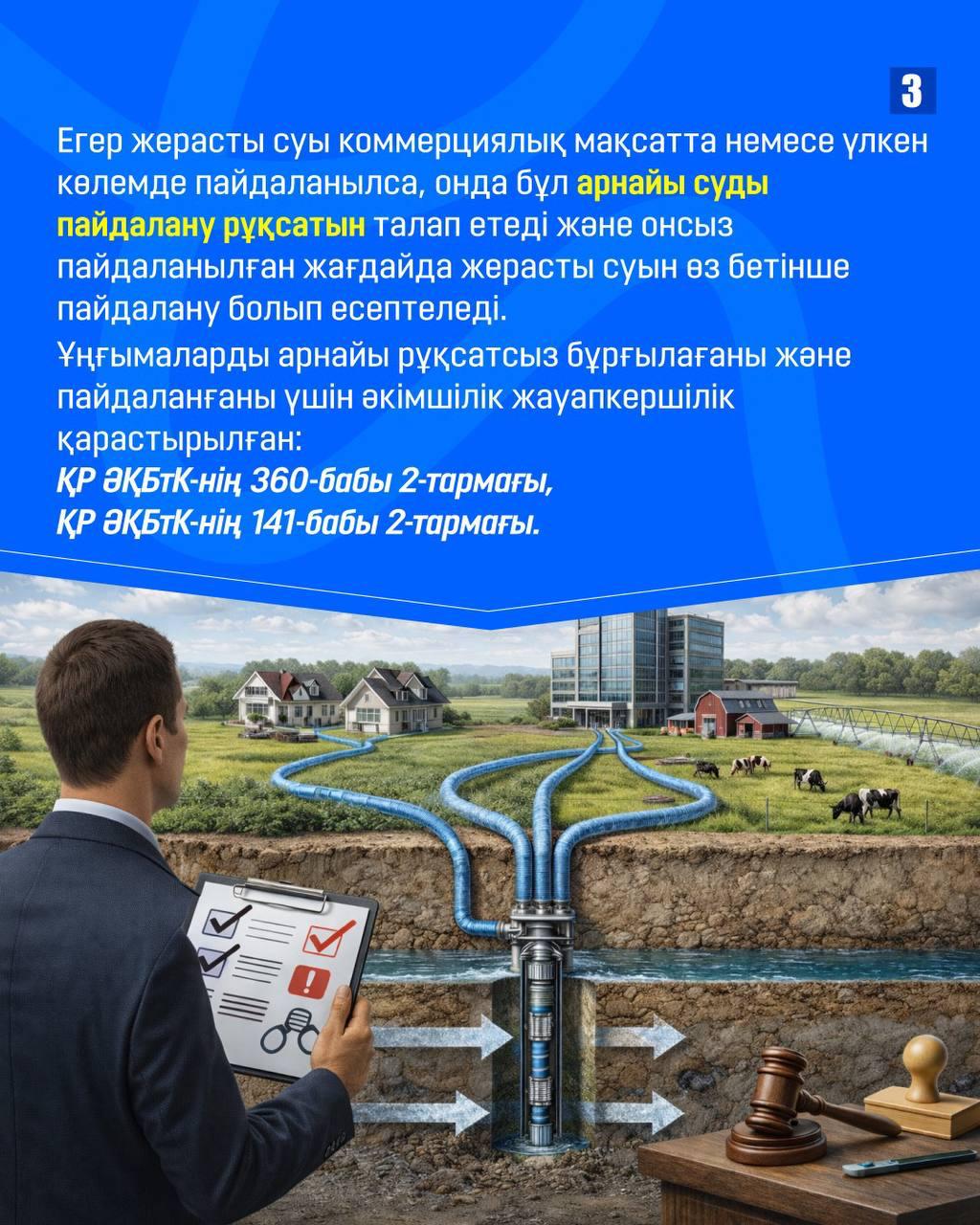 3. Егер жерасты суы коммерциялық мақсатта немесе үлкен көлемде пайдаланылса, онда бұл арнайы суды пайдалану рұқсатын талап етеді және онсыз пайдаланылған жағдайда жерасты суын өз бетінше пайдалану болып есептеледі.